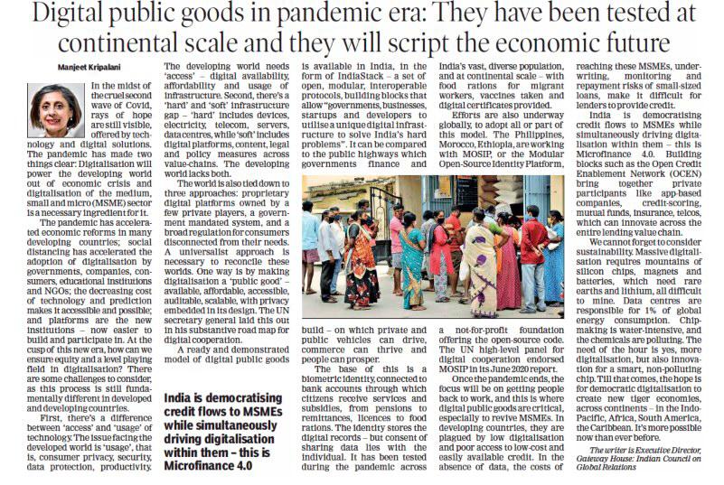 The article paints a vivid picture of digital public goods (DPGs), highlighting their importance in a post-pandemic recovery phase and the paradigm shift needed in global focus to help economies recover, particularly with respect to MSMEs, which are plagued by low digitalisation and poor access to low-cost and easily available credit. The author talks about India’s headway in resolving some of these issues through Microfinance 4.0, fortified by building blocks such as Open Credit Enablement Network (OCEN). She refers to IndiaStack, a ready and proven DPG model, and mentions that efforts are already underway globally to adopt the model wholly or in part. In this context, she cites MOSIP as an exemplary DGP whose open-source platform is being adopted by several developing countries, including the Philippines, Morocco, and Ethiopia, to set up their digital foundational identity systems.